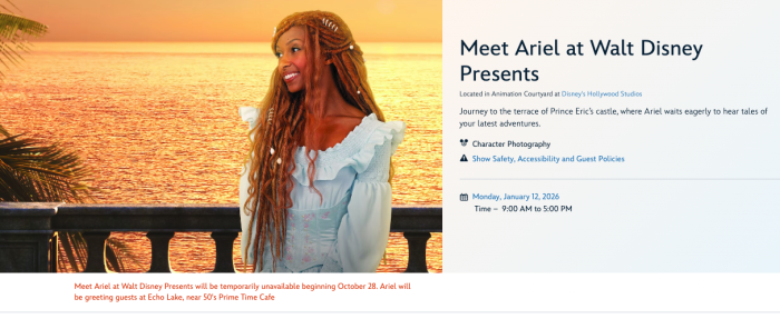 Disney had shared online that this change was temporary, but we weren’t sure when she would be moving back home until now! On Disney’s website, we noticed that Ariel’s meet and greet location at Walt Disney Presents is showing times again for January 12th, 2026.