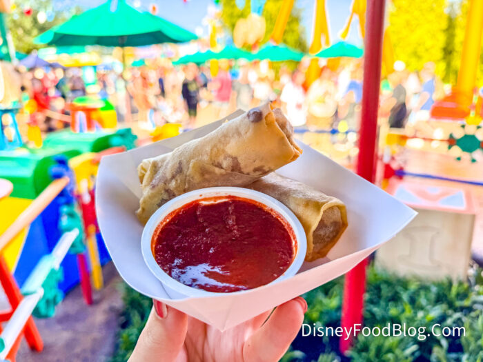 We’ve already shared our excitement about the grand opening of the new Popcorn and Snacks stand in Toy Story Land (we’ve been following the construction of this new snack spot for a while!). Imagine our surprise when we found Pizza Planet Spring Rolls on the menu for $9.49. So, OF COURSE we grabbed them. But how do they compare to the Pepperoni Pizza Spring Rolls in Magic Kingdom?