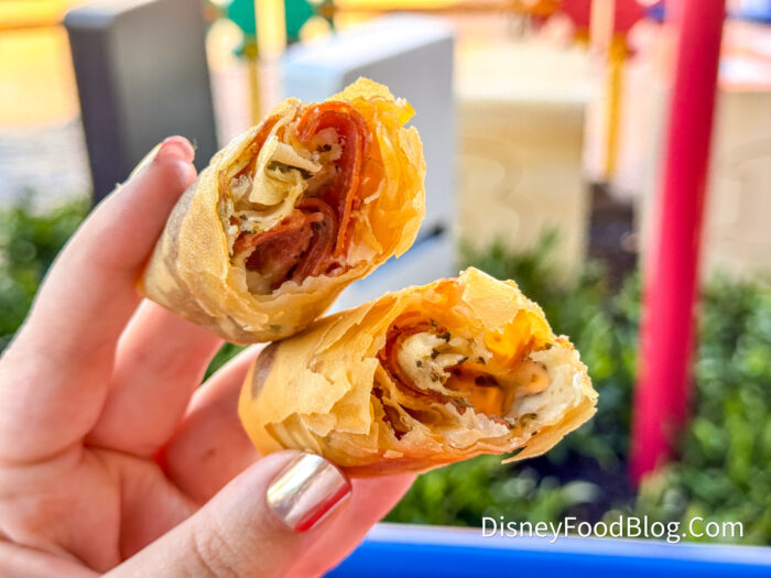 We will say that the Pizza Planet Spring Rolls are a little less greasy than the last ones we had in Magic Kingdom. Like that’s it. You get the big round pepperonis stuffed in there, just like the ones in Magic Kingdom. Now, you will find plenty of mozzarella cheese in these rolls, along with some Italian spices and garlic, but the pepperoni is the star here. And all of it is wrapped in a wafer-thin crispy spring roll wrapper.