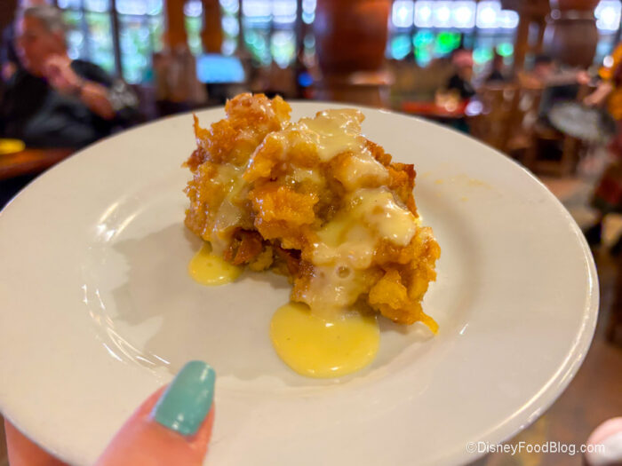 Then there’s the Bread Pudding with vanilla cream sauce on top. It’s a delicious bread pudding, and again, great for breakfast. There’s even some fruit or something in there, too. SO good.
