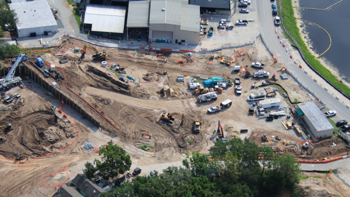 As site work continues on Piston Peak and Villains Land, Disney filed a construction permit for work outside the park’s berm. The permit, filed under Project K, consists of “construction of two buildings and associated parking, sidewalks, utilities, and stormwater conveyance,” and “the two existing dry retention ponds onsite will be modified, one to be a dry detention pond and the other to a wet detention pond” in an area located near backstage parking. It’s likely these will be offices for construction and Imagineering teams, based on the locations shown on the map.