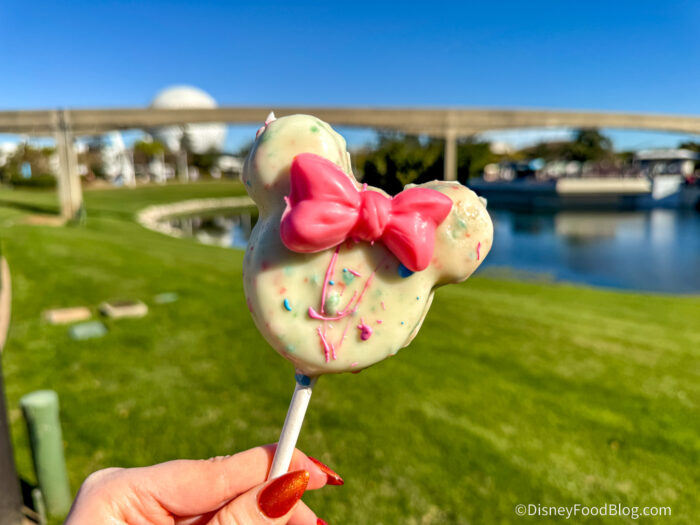 There are also tons of different kinds of food that are bright and colorful, and some even have flavors that the whole family will love. One dessert we think kids will go wild over is the Liquid Nitrogen Minnie Cake Pop with cotton candy sponge cake, white chocolate ganache, and colorful chocolate splats. It was light and not too sugary with fun Pop Rocks, too!