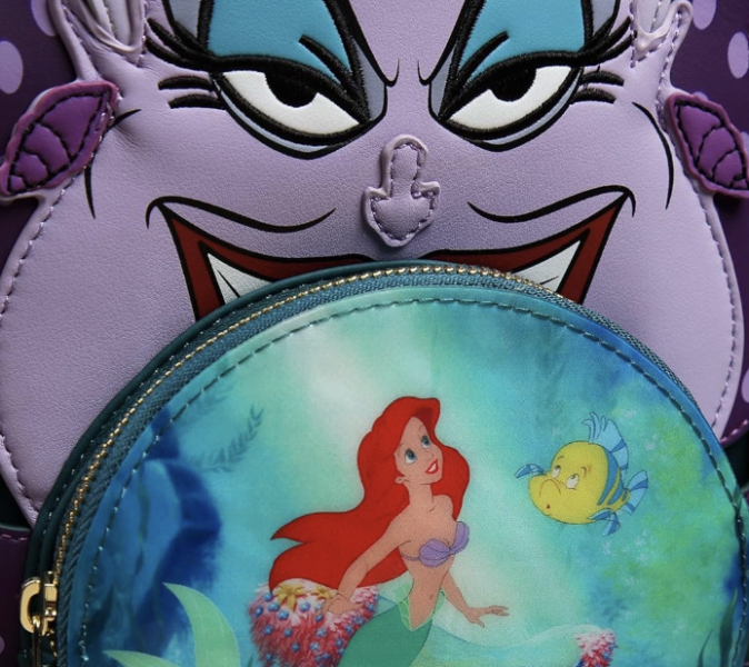 The sea witch is here to haunt your dreams, and haunt them she will. The polka-dot tentacle accents are super fun here, and we love the crystal ball view of Ariel and Flounder. The straps of the backpack feature the evil eels, Flotsam and Jetsam are a fun touch as well!