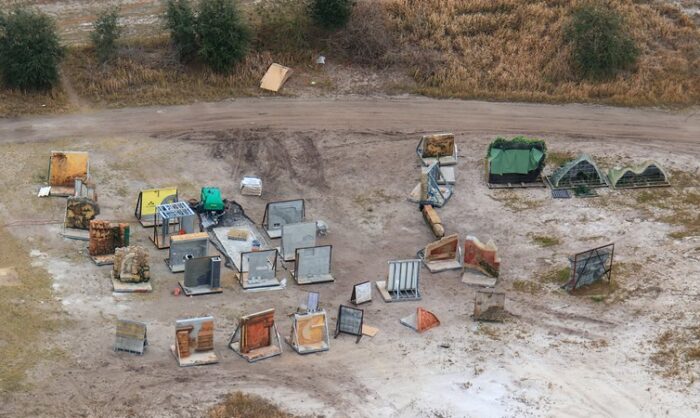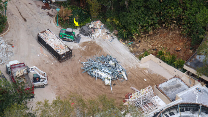 Thanks to @bioreconstruct on X/Twitter and Instagram, we’ve got a new look at the Tropical Americas construction at Animal Kingdom. At the former DINOSAUR ride, the exterior fountain and Iguanadon statue have been removed. There’s now a layer of dirt in its place. Disney seems to be in the process of gutting the ride since there’s a large pile of metal poles on the ground, in addition to what looks like fossil pieces from the queue in the pile on the top left corner.