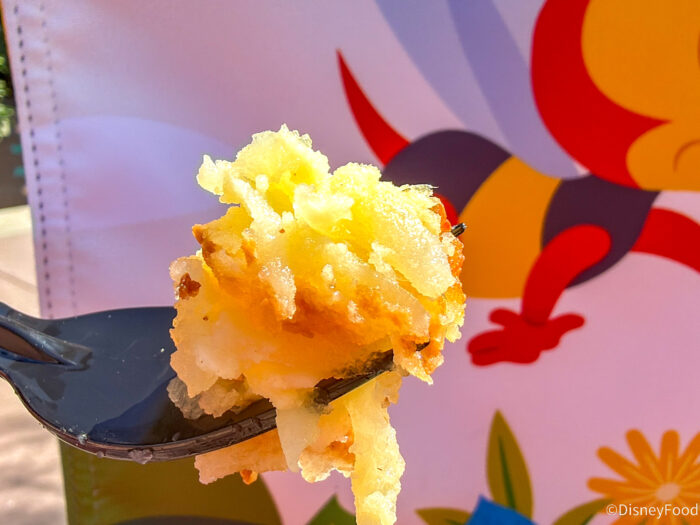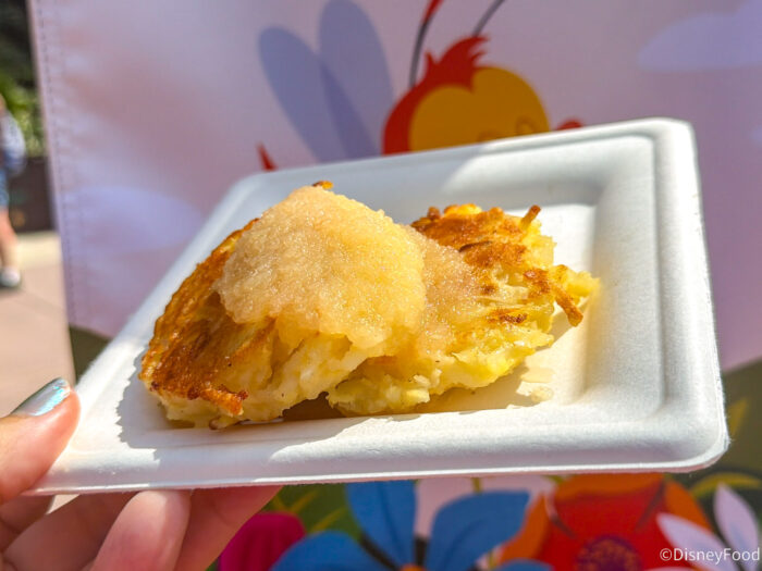 First up, we grabbed Potato Pancakes with house-made applesauce for $5.29. This is a returning item this year, and is part of the Garden Graze plant-based food stroll, and is also listed as one of EPCOT’s Kids Picks.