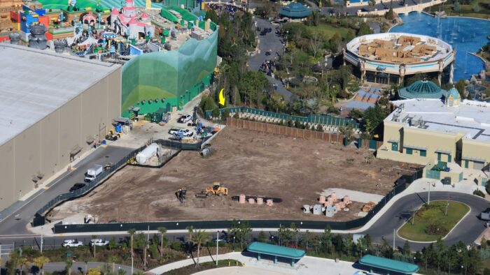 A few months ago, we shared some aerial photos of construction beginning in one of the empty lots. That lot is located next to Super Nintendo World, just outside of Celestial Park. Construction materials had been delivered, and some equipment had arrived on-site. It’s not yet certain if this is the construction zone for which the attraction permit was filed.