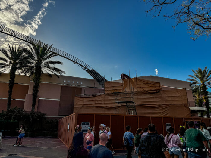 Disney has already made tons of progress on the new version of this iconic attraction! The previous name of the ride has already been removed from multiple locations, including on the guitar, which is now behind the scrim and scaffolding.