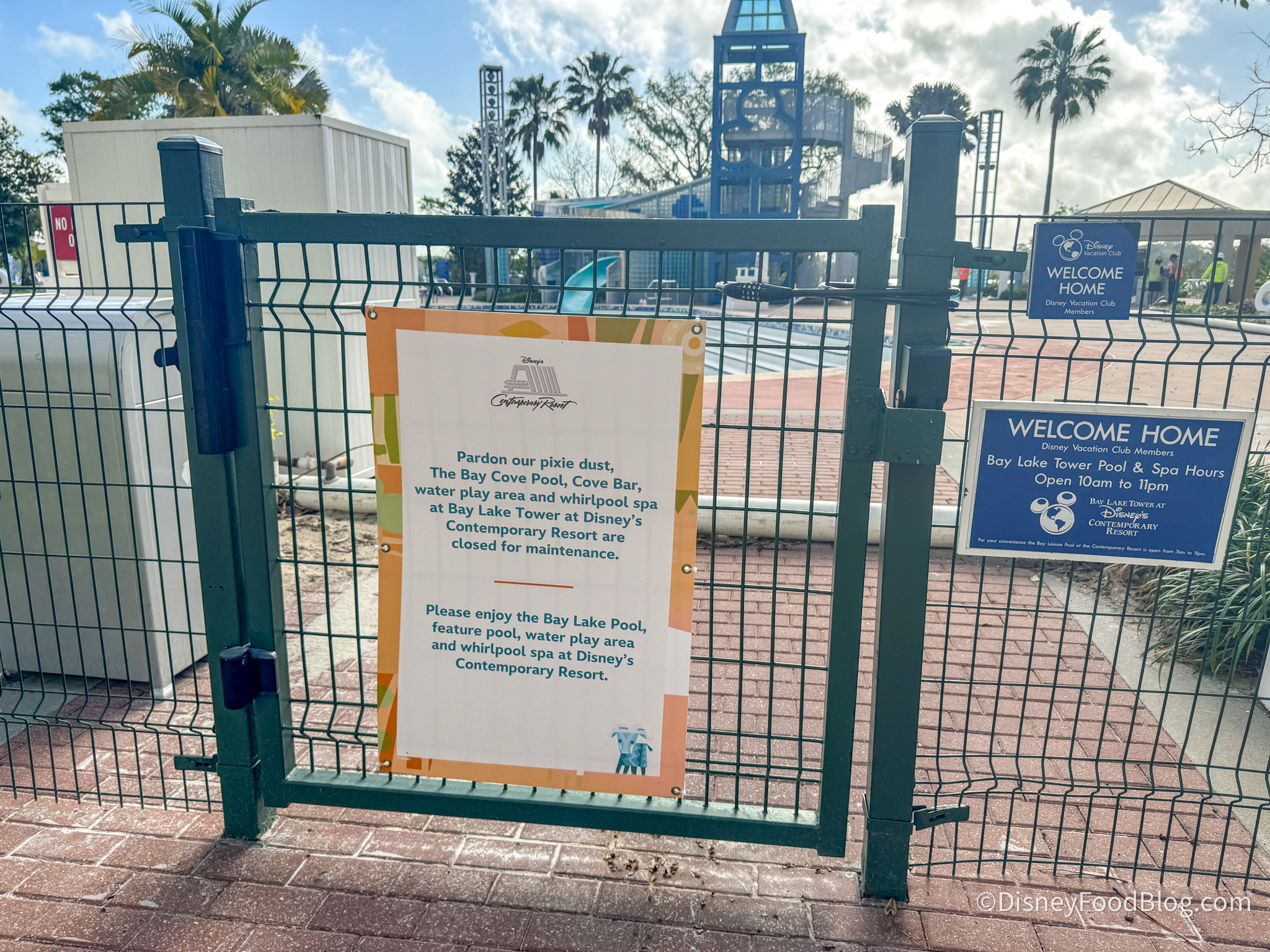 The Bay Cove Pool, the water play area, and the whirlpool spa at Bay Lake Tower at Disney’s Contemporary Resort are temporarily closed for maintenance.