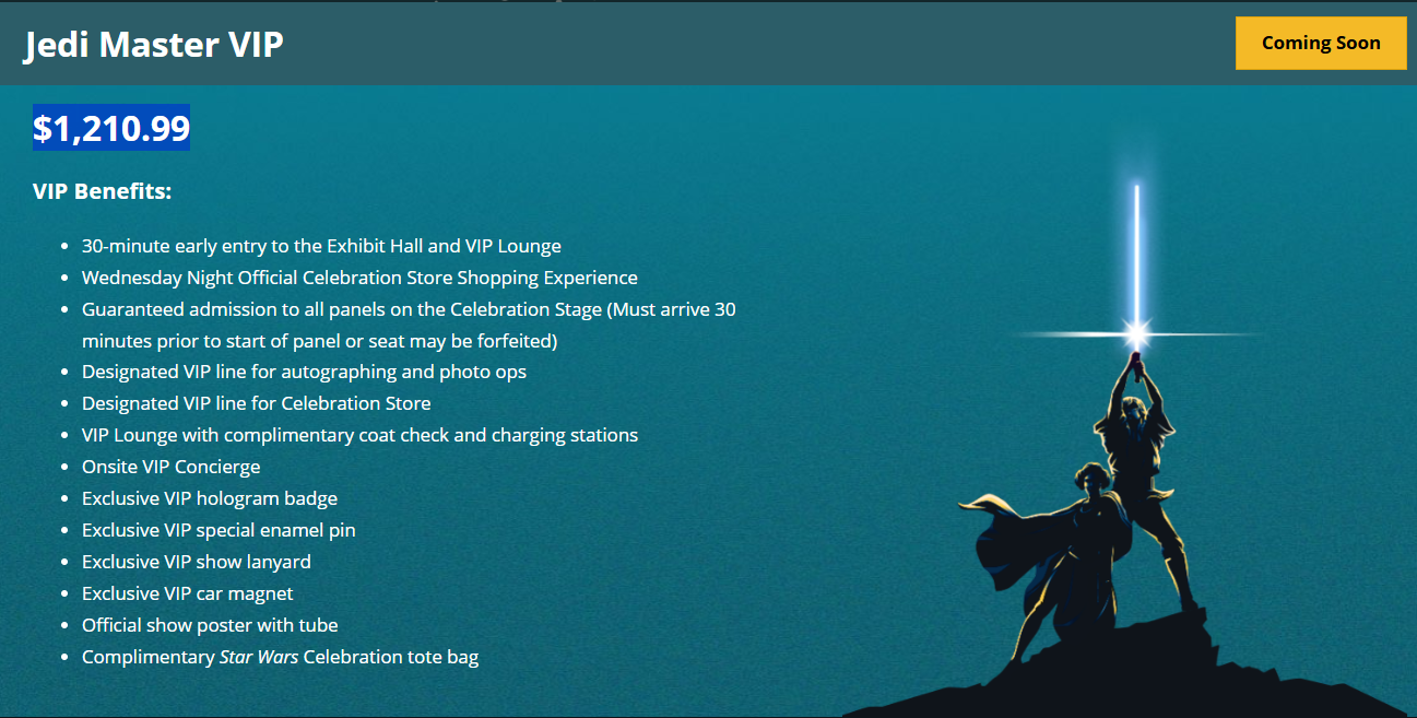 Tickets range in price from $76 (Thursday-only ticket) to $260.99 (general 4-day ticket) for adults and $36 (Thursday-only ticket) to $105.99 (general 4-day ticket) for kids. A limited number of Jedi Master VIP tickets will be available for $1,210.99 — that ticket covers the celebration, early entry, special shopping opportunities, vip lines for autographs and photos, vip lounge, special badges and lanyards, a free tote bag, and more.