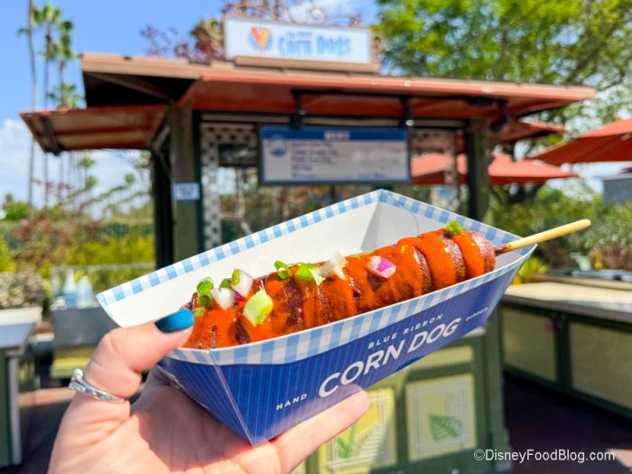 However, the almighty corn dog is also an iconic Disneyland snack, and Blue Ribbon Corn Dogs in Downtown Disney is one of those dining spots we visit A LOT, especially when they drop NEW corn dogs. Now, Blue Ribbon has been known to play around with unique flavors (we can’t forget the infamous Pickle Corn Dog), and now it’s come out with a brand new corn dog, the Buffalo Chicken and Cheese Corn Dog. So, yes, WE GOT IT.