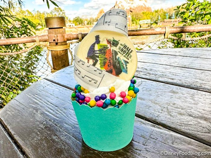 The Celebrate Soulfully Cupcake is back this year! It’s a vanilla cake with bananas foster filling, vanilla marshmallow buttercream, a Joe Gardner (from Pixar’s Soul) white chocolate medallion, and edible paper music notes with multi-color crispy pearls.