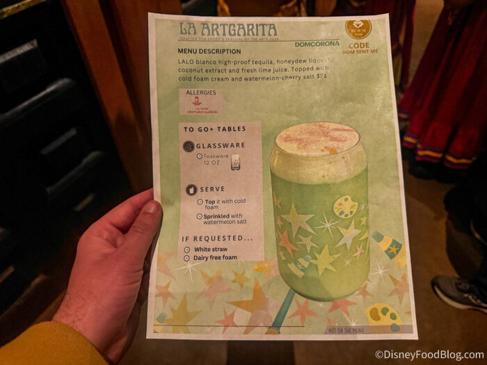 - Artgarita — LALO blanco high-proof tequila, honeydew liqueur, coconut extract, and fresh lime juice, and is topped with cold foam cream and a watermelon-cherry salt, $21.00 (P.S. You need a SECRET CODE to order the Artgarita!)