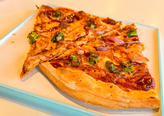 - BBQ Chicken Pizza: Two slices of freshly baked pizza topped with smoked chicken, sweet barbecue sauce, cheese blend, peppers, and red onions (New) – $12.29