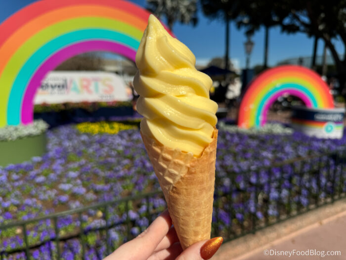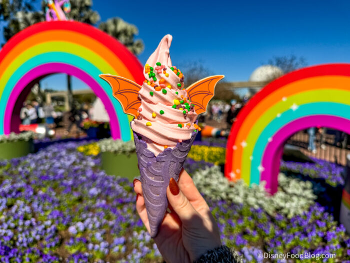 - Imagination Cone: Pink vanilla soft-serve in a lavender cone, “sparks” of imagination, and white chocolate Figment wings — $6.99, DDP Snack Eligible