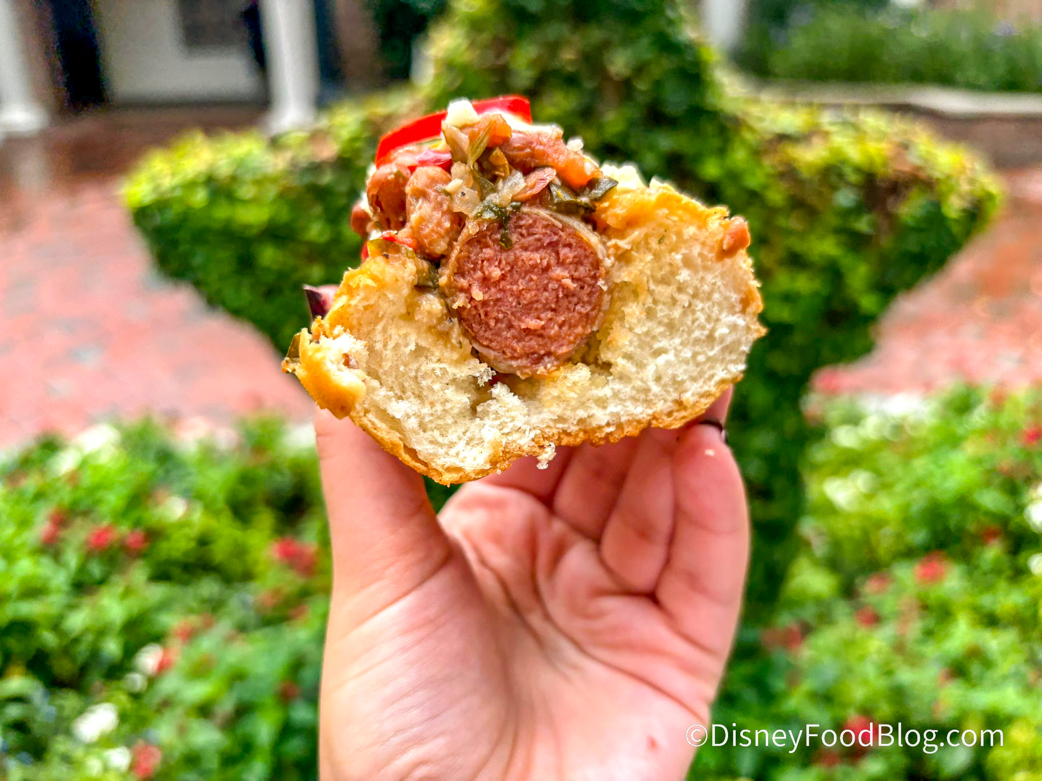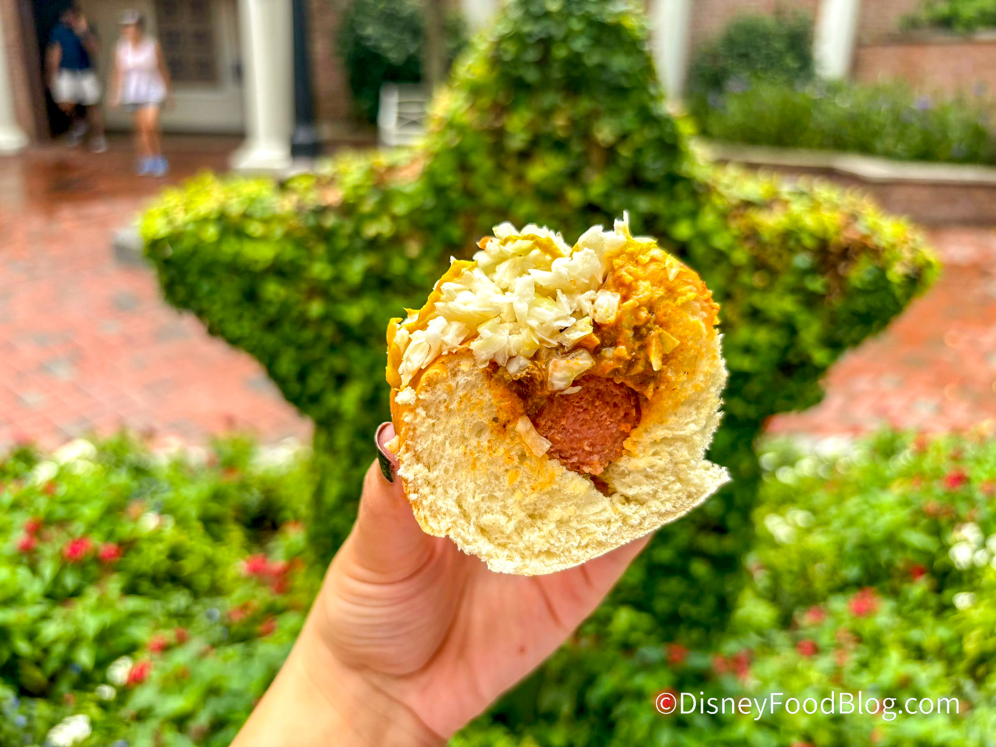 - New York-style All Beef Hot Dog with sauerkraut, onion-tomato sauce, and spicy mustard in a brioche bun (New) — $6.75, Disney Dining Plan snack credit eligible