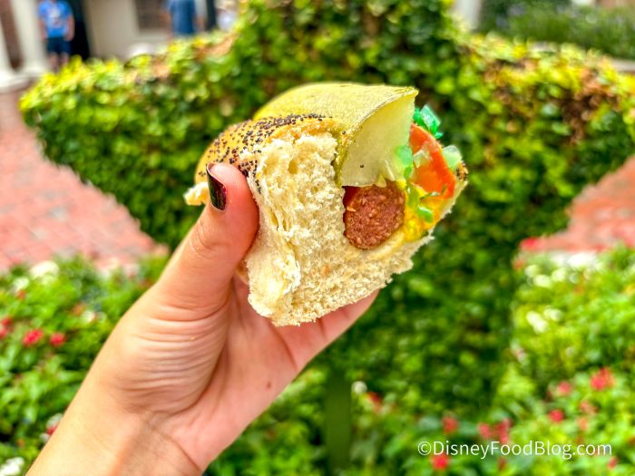 - Chicago-style All Beef Hot Dog with tomato, dill pickle, pickled sport pepper, diced onions, yellow mustard, and Chicago green relish in a poppy seed bun (New) — $6.75, Disney Dining Plan snack credit eligible