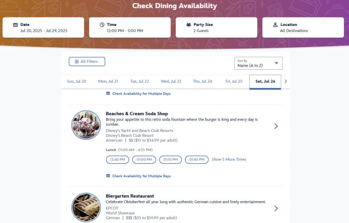 You can also book online using the Disney World Website. Just enter your search specifics in the Disney search box, or use the Check Availability Tool on any individual Table Service restaurant’s page.