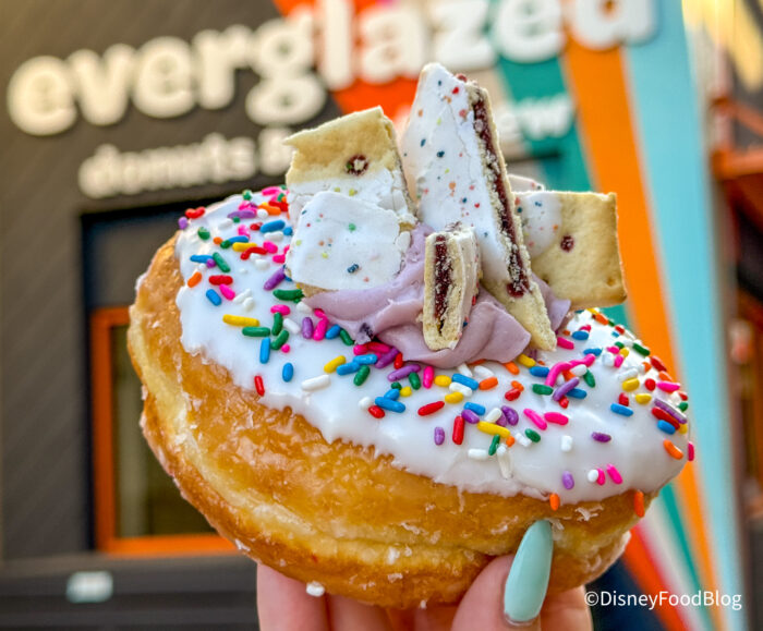 The Blueberry Pop-Tart Donut is $6.95. It starts with Everglazed’s signature glazed donut – a pillowy soft donut with a sweet hardened glaze. Then it’s topped with a white icing and rainbow sprinkles that are reminiscent of our favorite childhood breakfast.